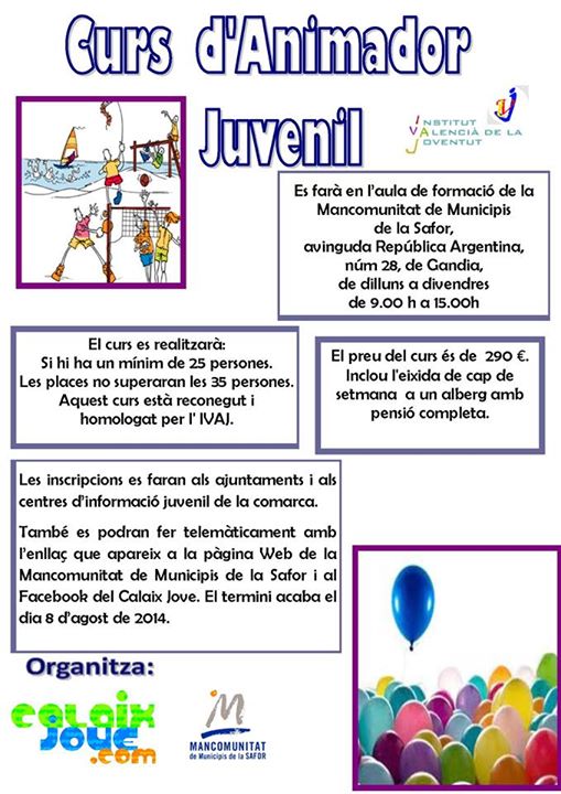 El Calaix Jove la Mancomunitat de Municipis de la Safor, organitza un curs d’ANIMADOR JUVENIL. Comença l’1 de setembre fins al 23 d’octubre de 2014. Pots fer la preinscripció al següent enllaç: