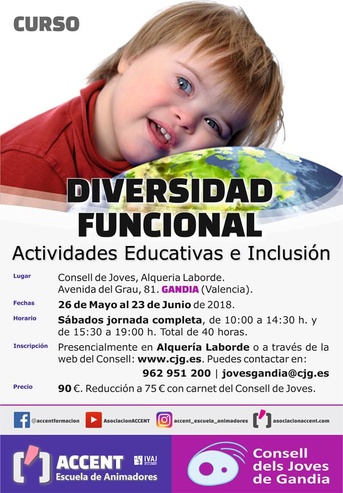 - Curs Diversitat Funcional – Activitats Educatives i Inclusió (40 hores) Dates: 26 de maig al 23 de juny de 2018 Horari: Dissabtes de 10.00 a 14.30h. i de 15.30 a 19.00h. Preu: 90€ (75€ amb descompte del carnet del Consell dels Joves de Gandia)